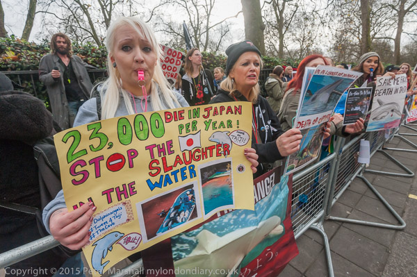 in Japan each yearA protest outside the Embassy called for an end the the annual slaughter of over 20,000 dolphins, porpoises and small whales in Taiji Cove in Japan, where their blood turns the sea red.