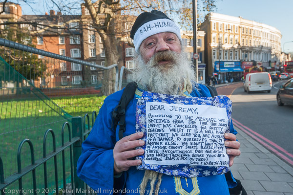 Roy Bard of Mental Health Resistance Network with a present of incontinence pads for Jeremy Swain of Thames Reach Employment Academy,