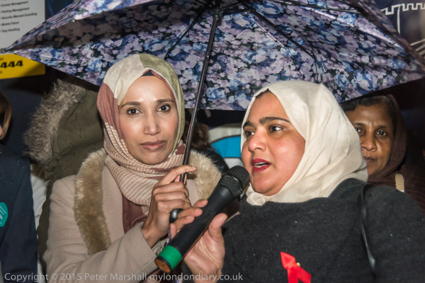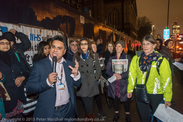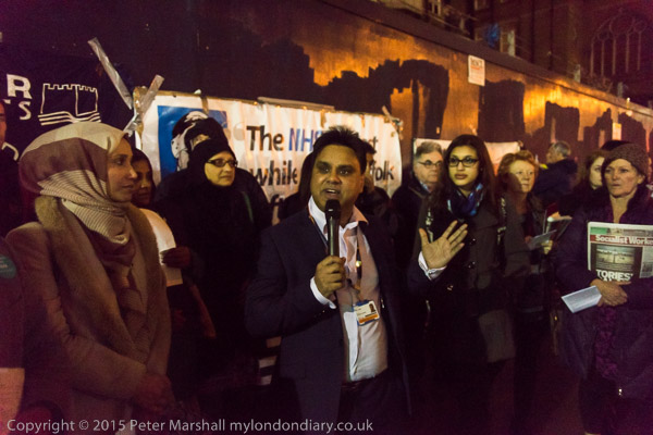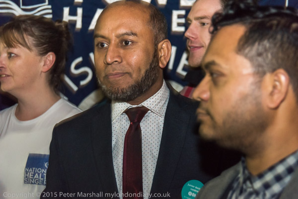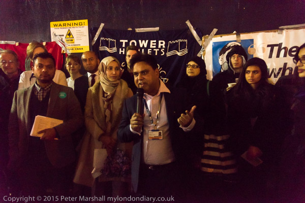 Tower Hamlets Councillor Oliur Rahman hands out leaflets at the prot