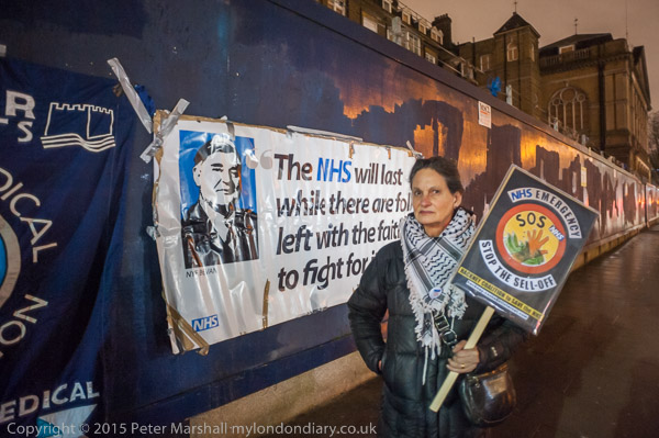 Woman with placard in front of Nye Bevan banner at protest in front of now abandoned old Royal London Hospital buildings