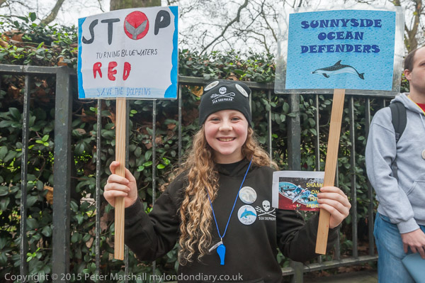 and she holds a placard with a bleeding heart and a dolphin. Behind her the Japanese flag on the embassy cross the road