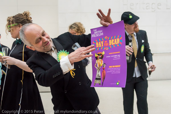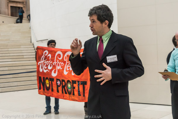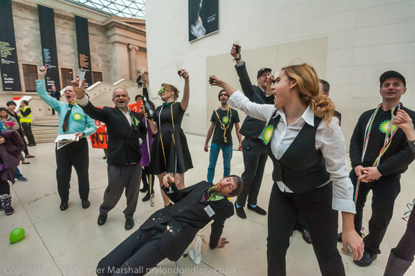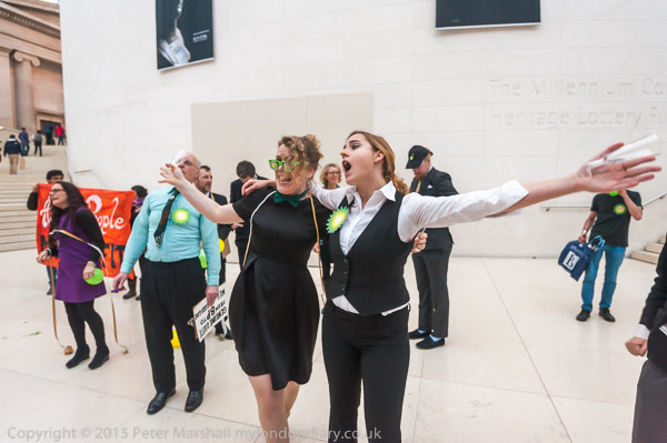 'Art for People - Not Profit' banner in the Great Hall of the British Museum