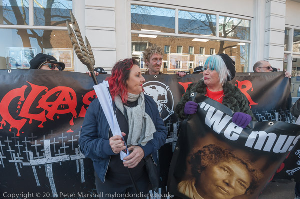 Class War leave the march to protest outside an estate agents. Lisa McKenzie with her trident