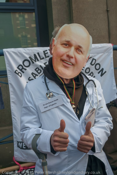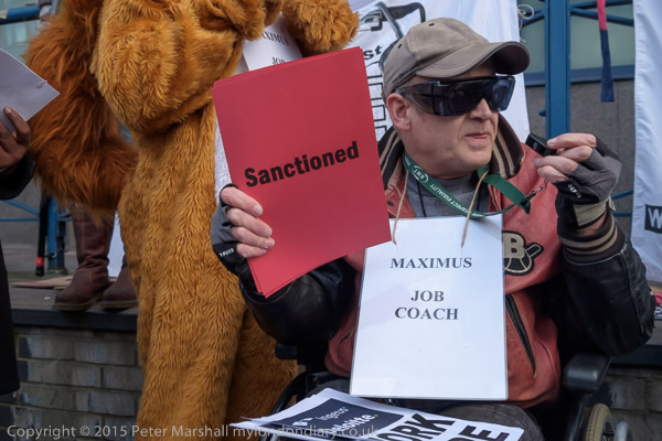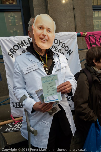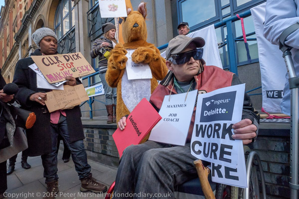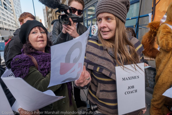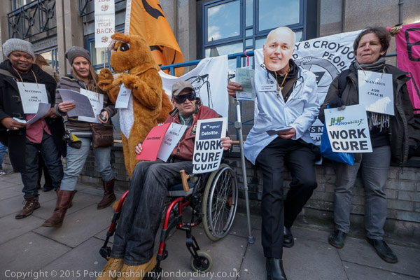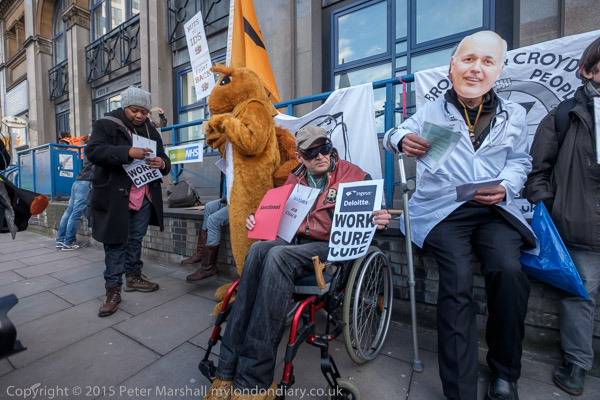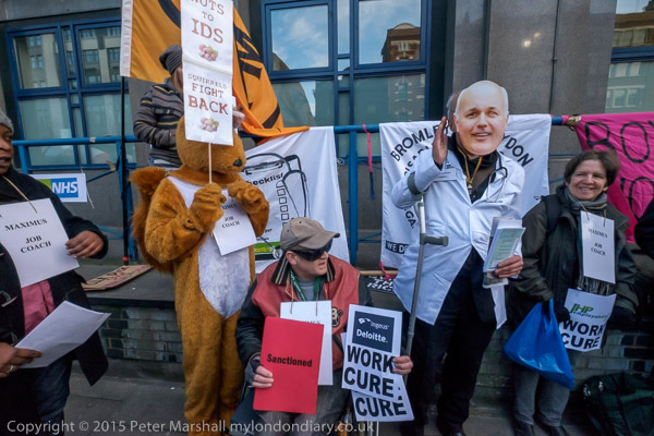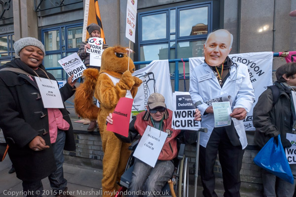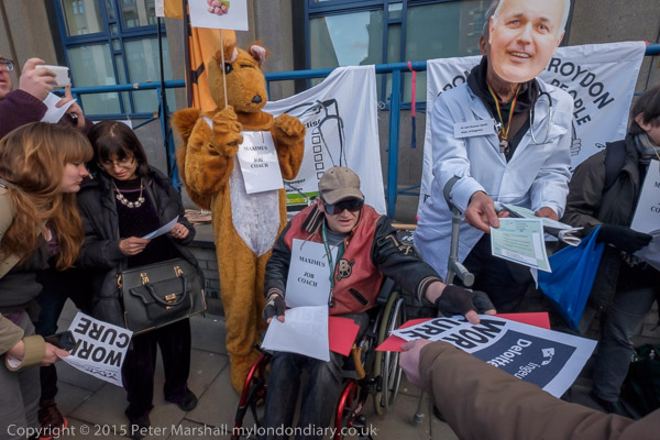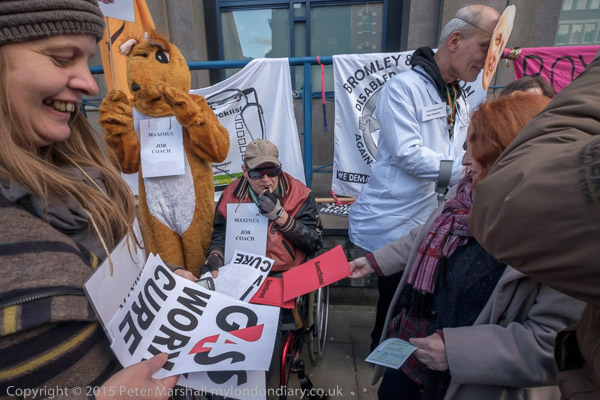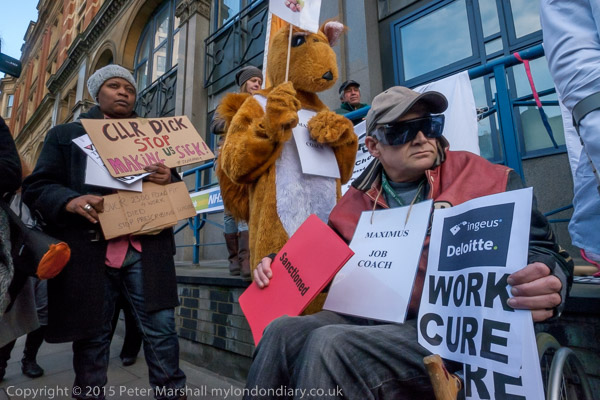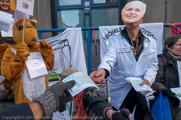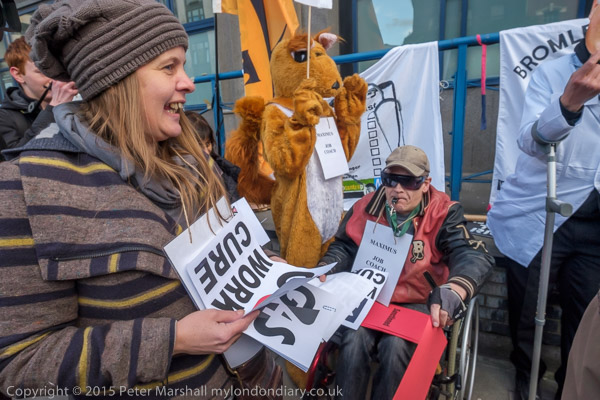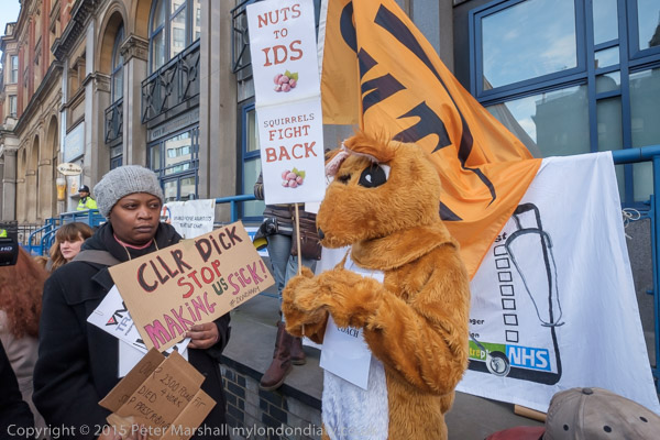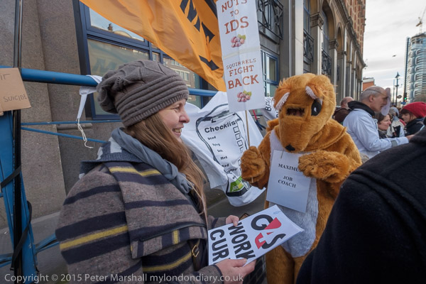 One of the Maximus job coaches was dressed as a squirrel, with a placard 'Nuts to IDS - Squirrels fight back'