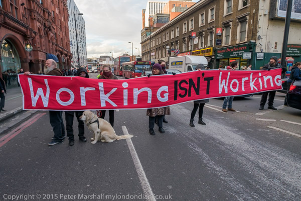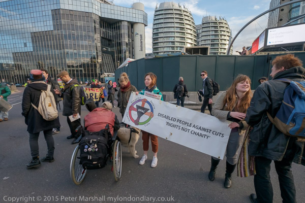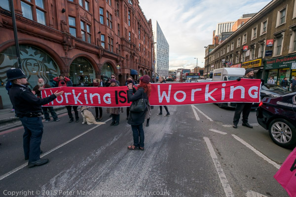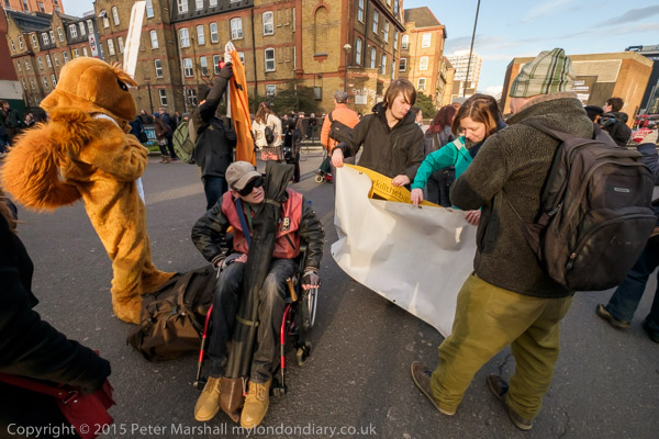 The protesters move on to the Old St roundabout, stopping the traffic on one of London's busiest roundabouts