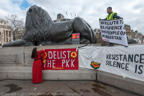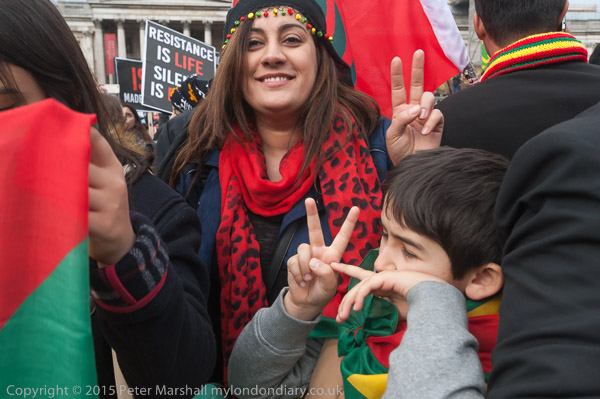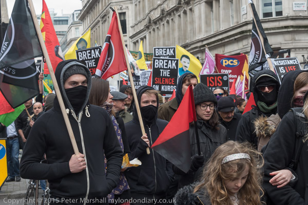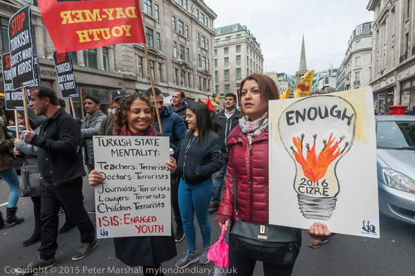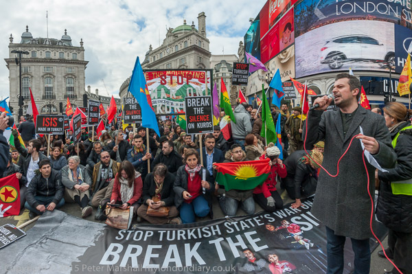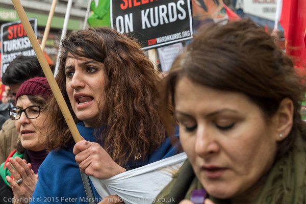The front of the march with the banner ''Stop Turkish State's War on Kurds Break the silence on Kurds'