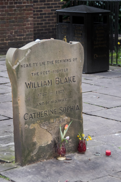 William Blake was buried a little this side of the tree on the far side of the path. His wife on the south side of the cemetery close to Susannah Wesley
