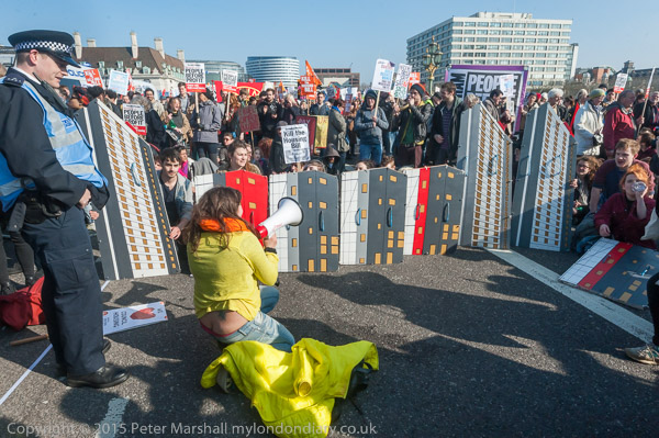 A wall of housing shields in front of people sitting on the road to block Westminster Bridge