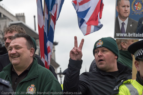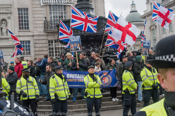 Around 15-20 Britain First protesters wave flags and hold placards around Eros