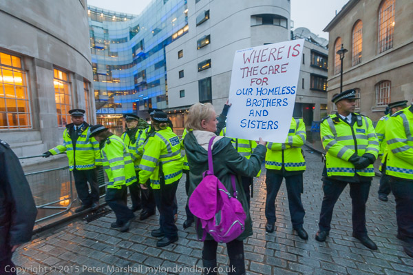 Which was protected by a line of police. A woman holds up a sign 'Where is the Care for our Homeless Brothers and Sisters'.