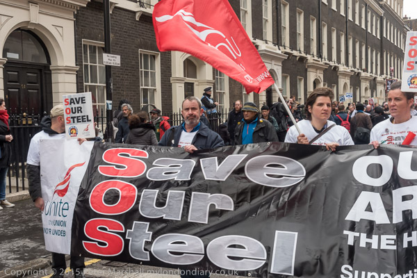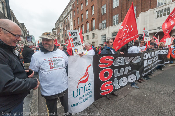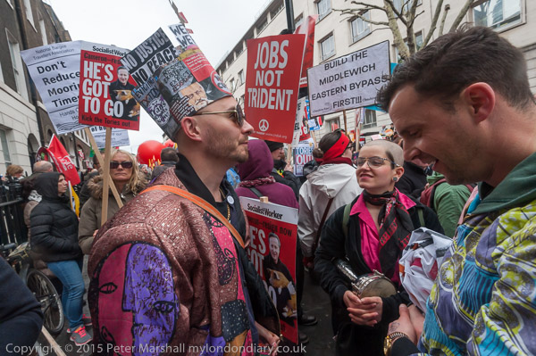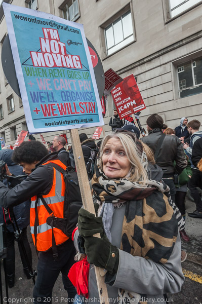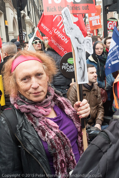 The main People's Assembly banner - 'We demand Health Homes Jobs and Education - Cameron Must Go'