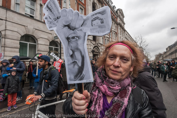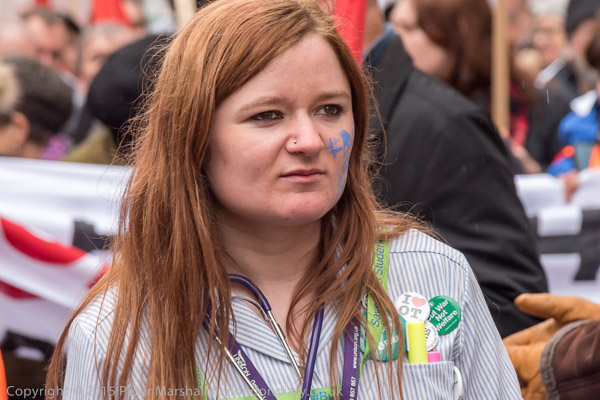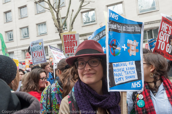 A woman marching for those unable themselves to march for the NHS and the Bursary or Bust campaign, supported by DPAC