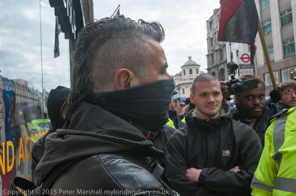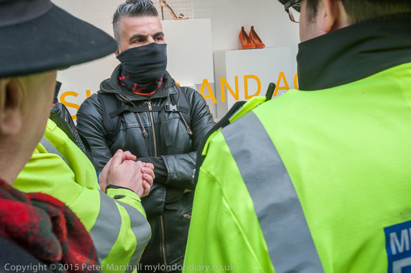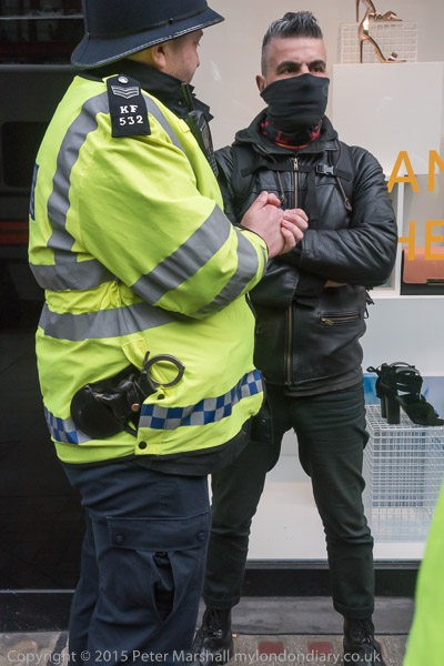 ![]() ![]() Police single out one of the protesters and attempt to talk to him. He ignores them ![]() ![]() ![]() A lone protester holds up two posters in front of a double line of police who have closed Topshop ![]() and the protesters move off ![]() walking through Trafalgar Square ![]() where people are still dancing, though the rally has ended |