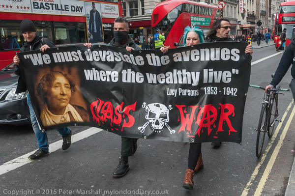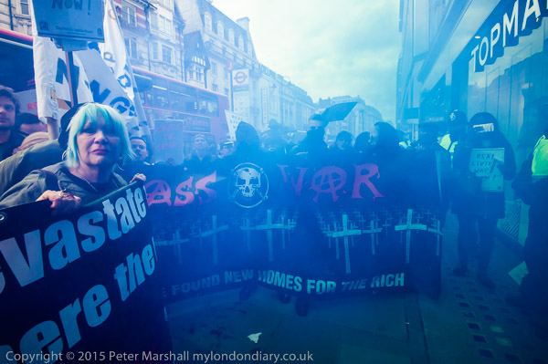 ![]() Sandy Nicoll is there with the SOAS Unsion banner to support the UVW protest ![]() The smoke is soon dense enough to make it hard to see what is happening ![]() ![]() The two Class War banners at the protest ![]() ![]() Protesters support the cleaners with posters 'Reinstate the Topshop 2' and 'We are not the dirt we clean' ![]() ![]() Petros Elis speaks ![]() ![]() and Suasanna, one of the 'Topshop 2' speaks' |