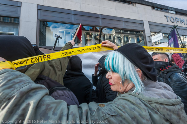 Protesters hold up posters as they face police guarding the side door of Topshop