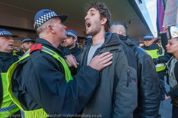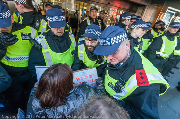Suddenly, as people were walking away, police grab one protester and drag her across Oxford St