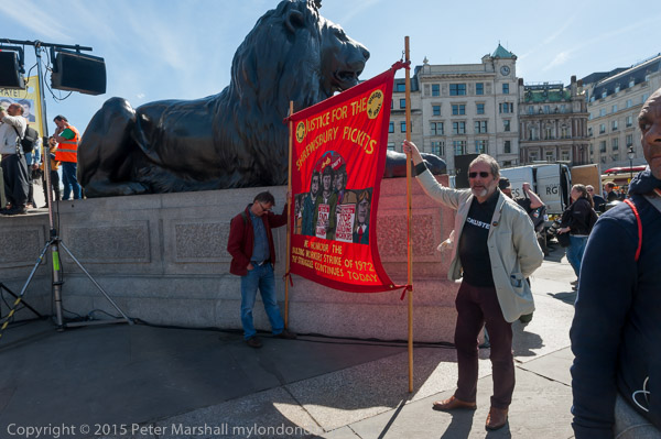 Justice for the Shrewsbury Pickets banner in front of one of the lions