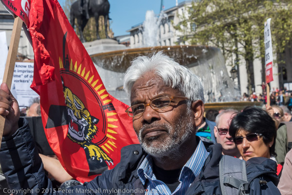 A man waves a Tamil TIgers flag. Several younger Tamils are waving them from the upper levels of the plinth