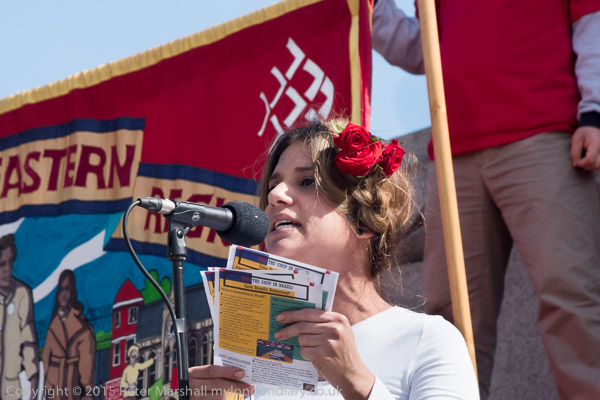Christine Blower, NUT General Secretary speaking, wearing a 'Born in the NHS' t-shirt. The NUT is supporting the