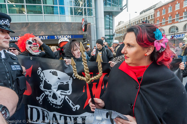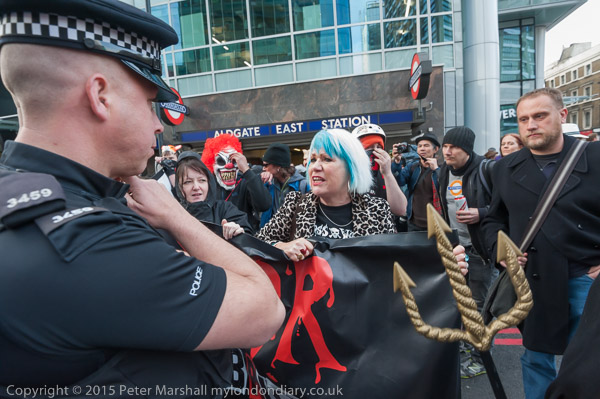 A police officer talks to the protesters who are shouting at one of the photographers who they think is photographing