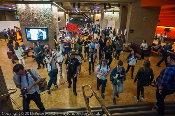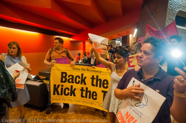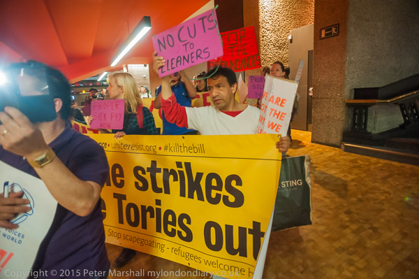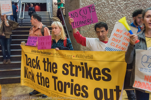 An UVW General Secretary Petros Elia speaks against cutting the cleaners jobs to the people waiting to go in to the concert