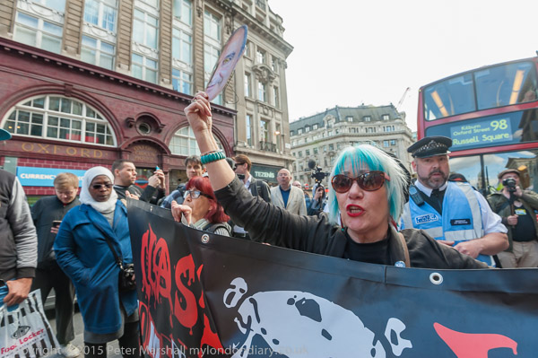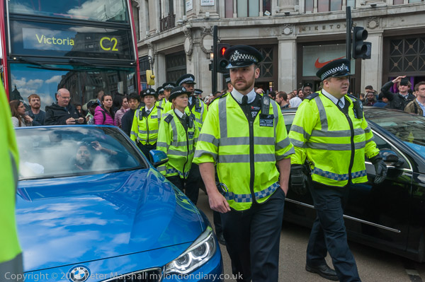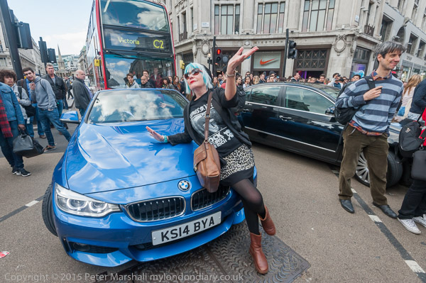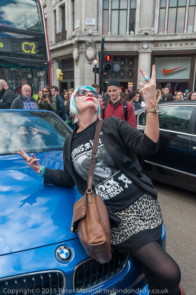 Jane Nicholl of Class War poses on the bonnet of a car which has been stopped by the protest