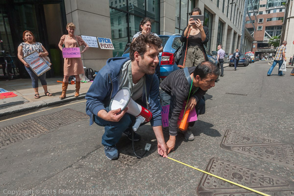 Jane Nicholl of Class War shows Petros Elia, UVW General Secretary, the 10 metre length of hazard tape