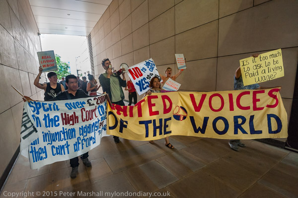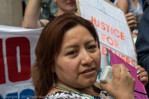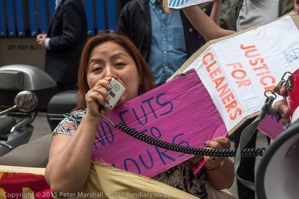One of the striking cleaners speaks at the protest. 'No to job cuts! Yes to a living wage!'