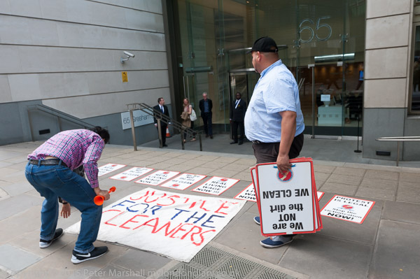 Cleaners put out posters and banners at the top of the steps leading up from 65 Gresham St, where Capita have offices