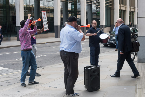 and 'Living Wage Now'. But the protest is also for the re-instatement of sacked African cleaners