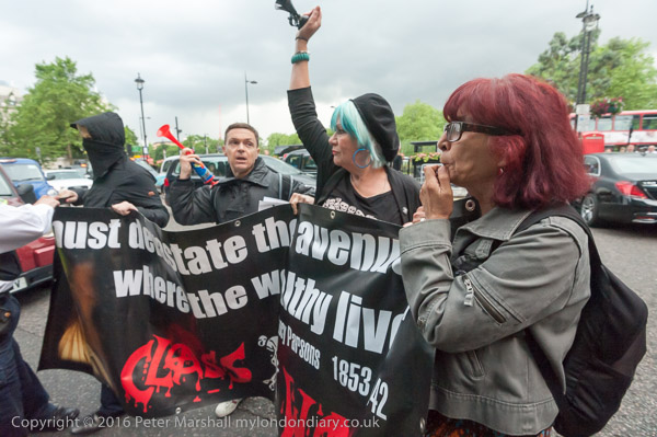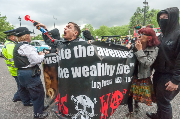 Police grab the Class War banner, but protesters hold on to it