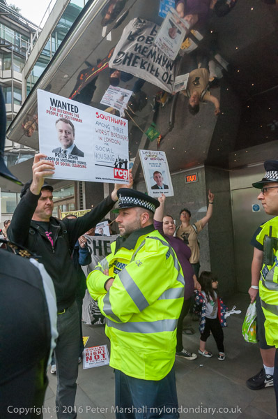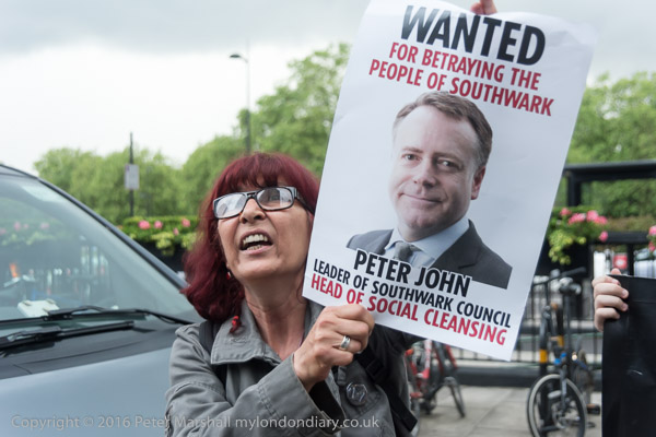Simon Elmer holds up a poster showing Peter John, Leader of Southwark Council 'Wanted for betraying the people of Southwark'