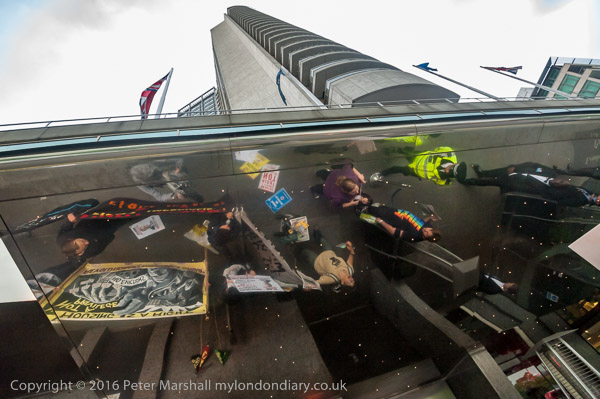 The protesters are reflected in the canopy outside the hotel - and it keeps the rain off them