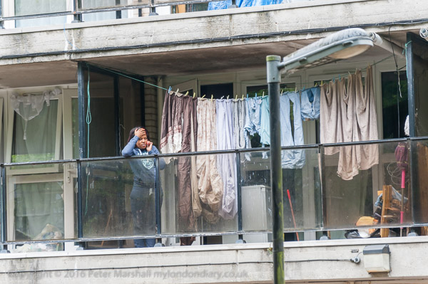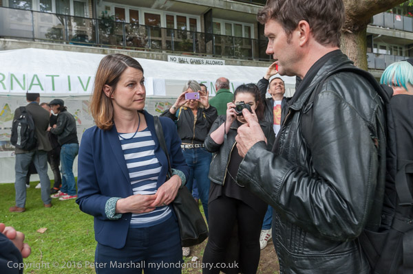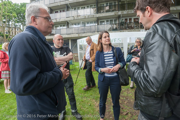 ![]() and comes up with 'Anarchy and Old Dogs' ![]() People from the estate and their views on display ![]() At left, Labour MP for Dulwich and West Norwood Helen Hayes ![]() One block on the estae houses shops and the Upper Norwood Community Resource Centre ![]() ![]() Opposite the shops is a block with a nuclear bunker at its base ![]() ![]() There was free tea, coffee and cakes for OAPs in the Resource Centre ![]() ![]() ![]() Simon Elmer of Architects for Social Housing asks Helen Hayes MP why she is at the Open Estates event ![]() when she has campaigned on the estate for the councillors who want to demolish it |