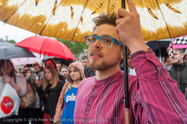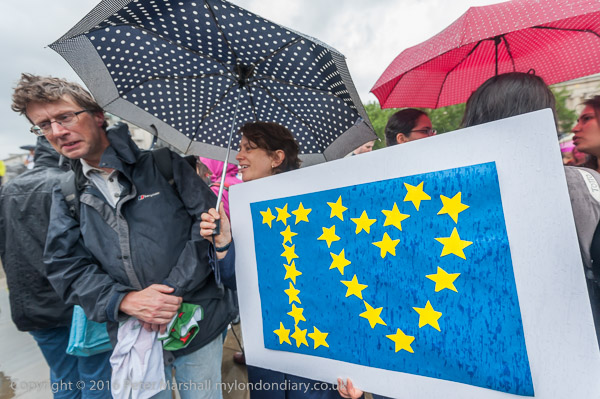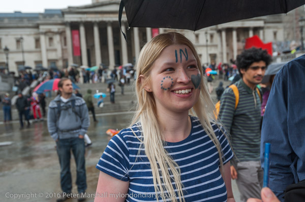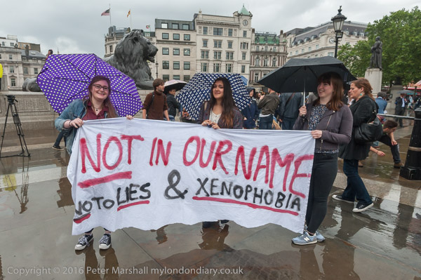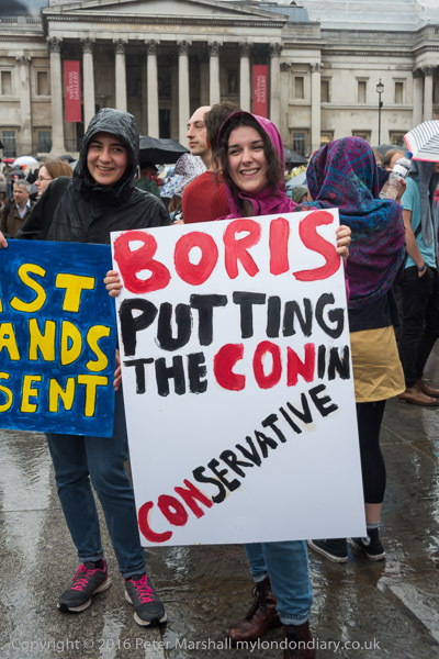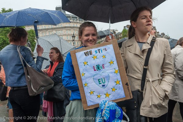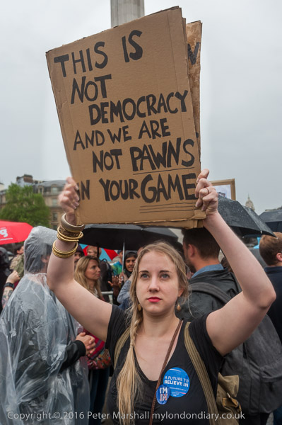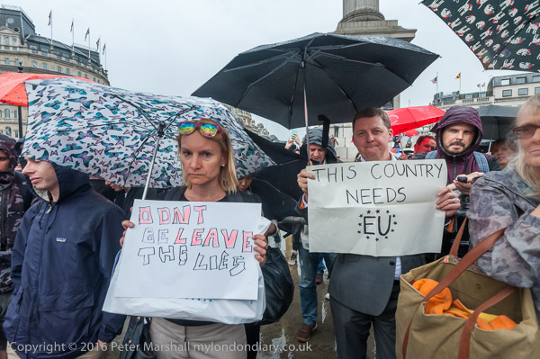 People gather in the rain for a protest after the Brexit vote. Everyone feels cheated as politicians deny the promises