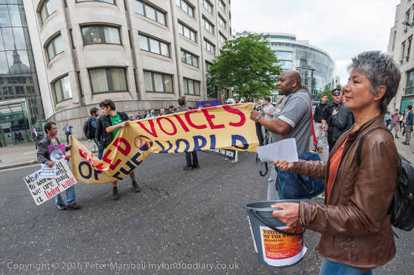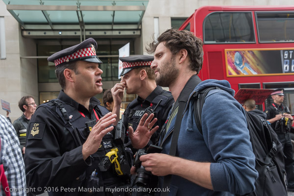 Police try to get UVW General Secretary Petros Elia to move - he tells them they will when the protest finishes in a few minutes