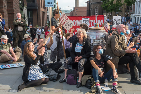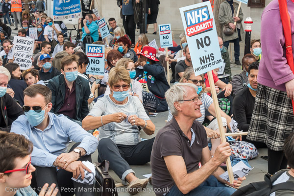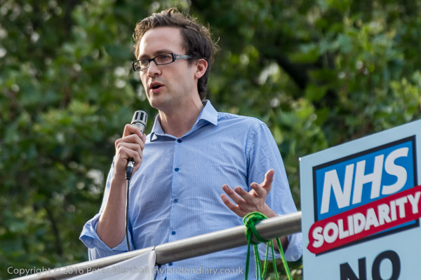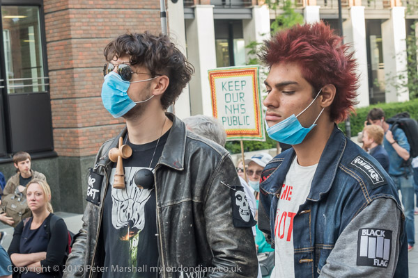 Junior doctor Aislinn Macklin-Doherty hands out posters reading 'NHS for Sale'