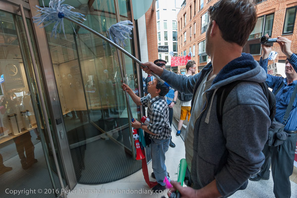 The protest pauses briefly on the road close to the front entrance of the CBRE offices in St Martin's Court