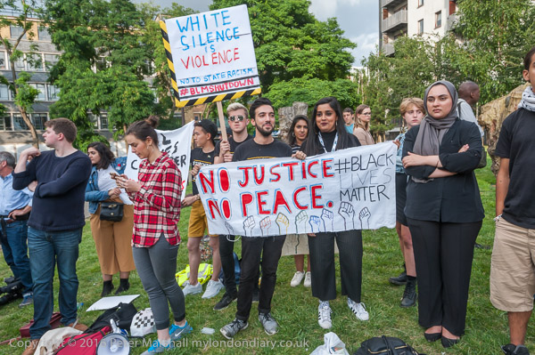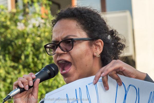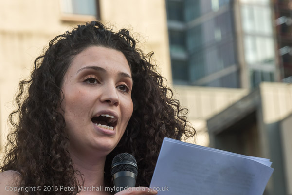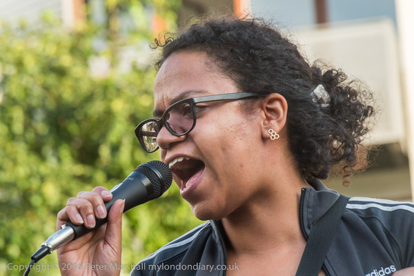 Antonia Bright of Movement for Justice speaks in Altab Ali Park in East London about the
