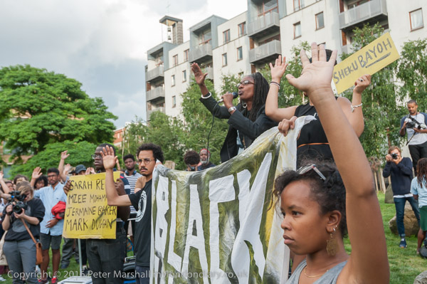 London, UK. 5th August 2016. Marcia Rigg, whose brother Sean Rigg was killed by police in Brixton in 2008, raises her fist in salute