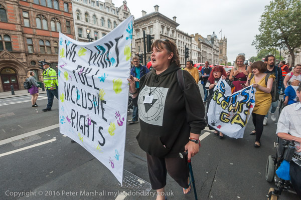 Protesters from DPAC who had lobbied Parliament and presented the Inclusion London report evaluating the disastrous effects of cutting care and support funding for personal assistance following the closure of the Independent Living Fund in 2015 marched to Downing St.