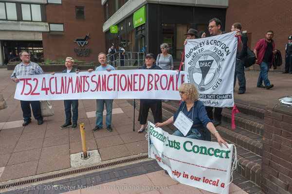 Bromley and Croydon DPAC protested outside Bromley Job Centre in the London Borough of Bromley to demand they stop the use of sanctions against benefit claimants and stop the abuse of benefit claimants.