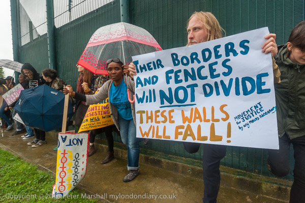Hundreds of protester braved persistent rain to stand for several hours in a protest organised by Movement for Justice waving and shouting support to the women asylum seekers held indefinitely inside Yarl's Wood, who responded enthusiastically by shouting and waving back from the prison blocks behind the high fence, hindered by windows that hardly open.