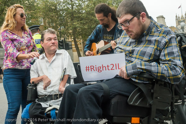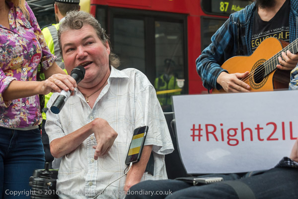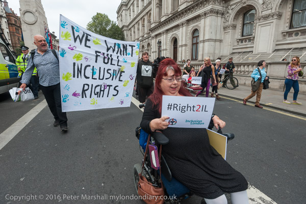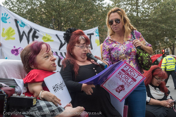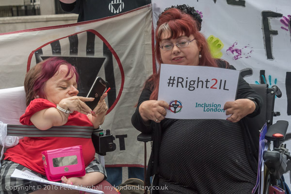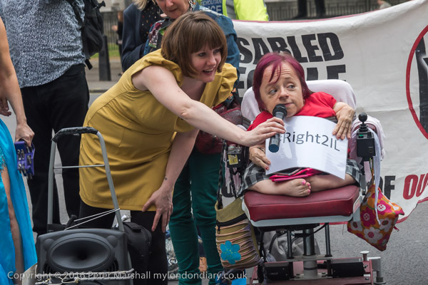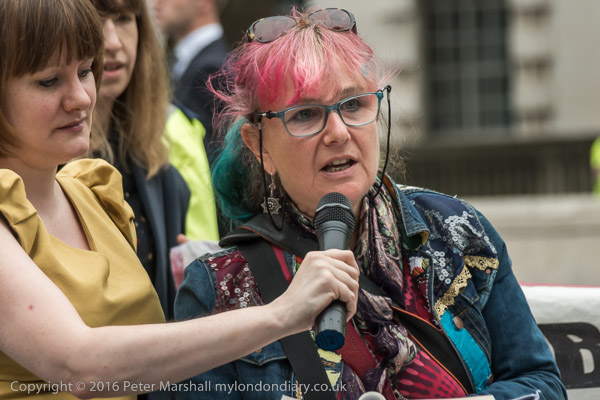 'Claire Glasman holds a poster 'Fund Independent Livinv NOT Traiden!'