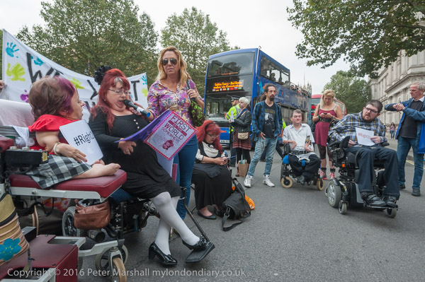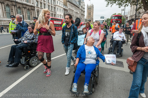 The protesters stop on the road in front of Downing St. Police direct traffic around them