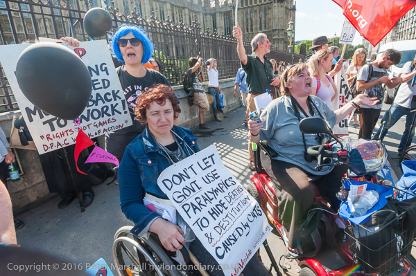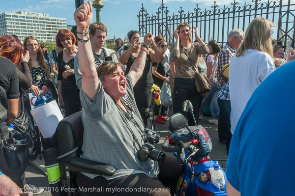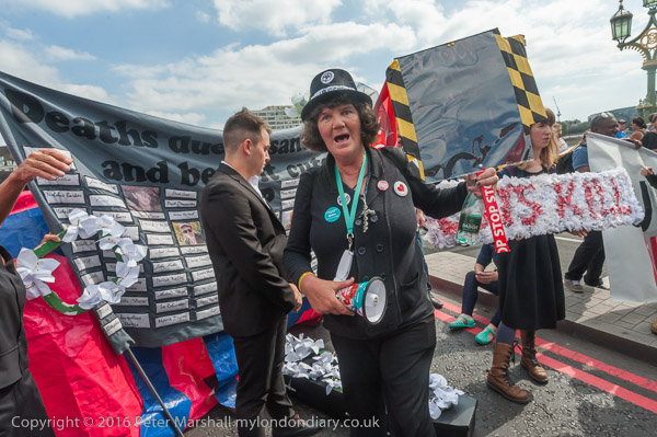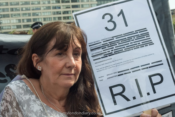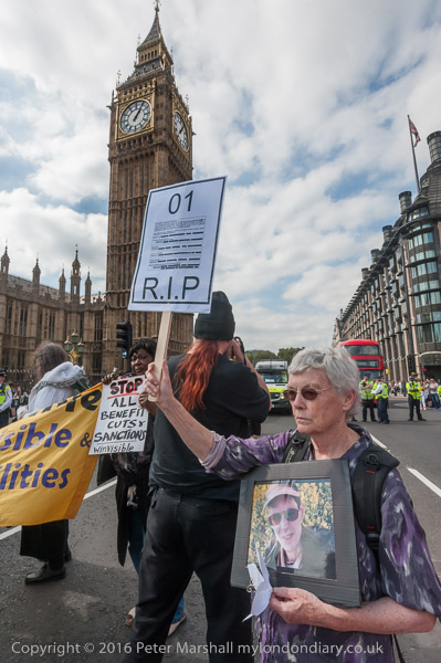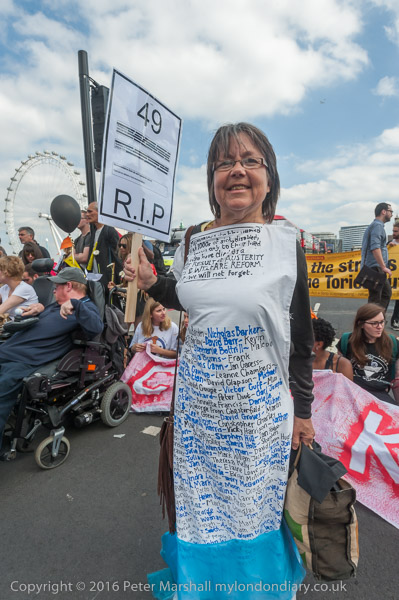 Placards give details of some who have died from benefit cuts. One woman wears an apron with some of their names. Others hold photographs of them