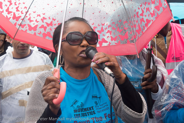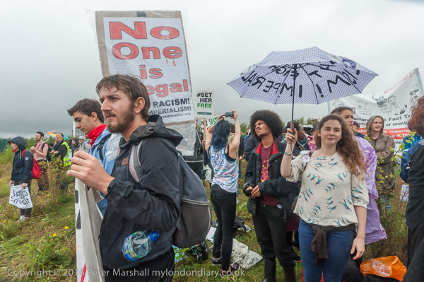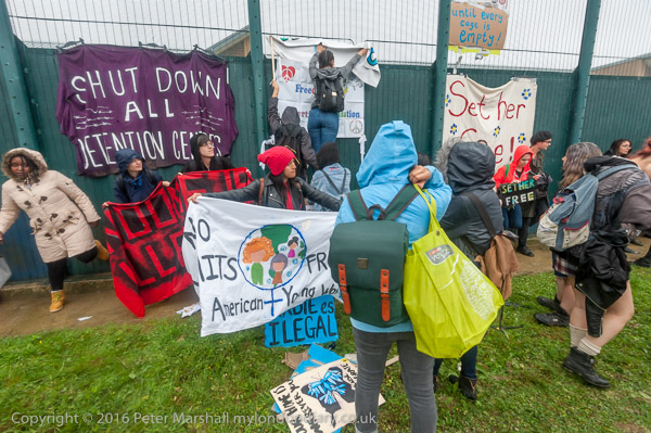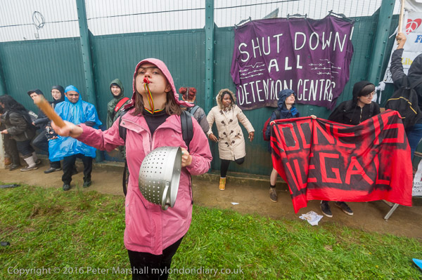 A woman holds a poster condeming two of the private companies that run our immigration prisons 'mitie murders - serco scum'