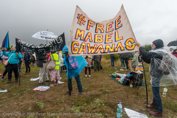 A large banner '#Free Mabel Gawanas' . This 42-year-old has been in Yarls Wood over 2 years, having fled