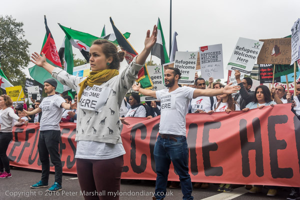 and the dancers come on to perform, wearing 'Refugees Welcome Here' on their chests