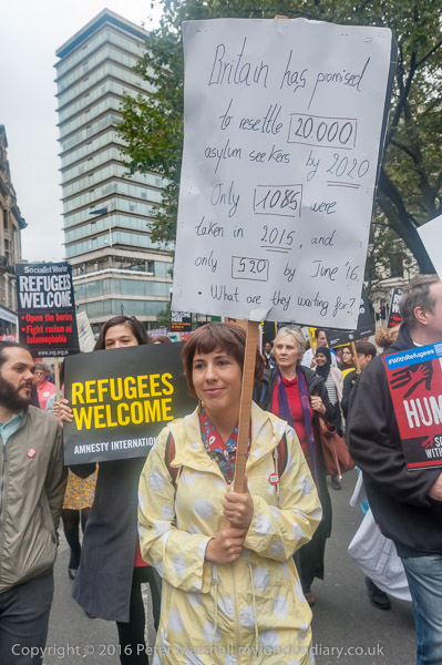 A poster details Britain's failure to act on its promise to take 20,000 asylum seekers by 2020,